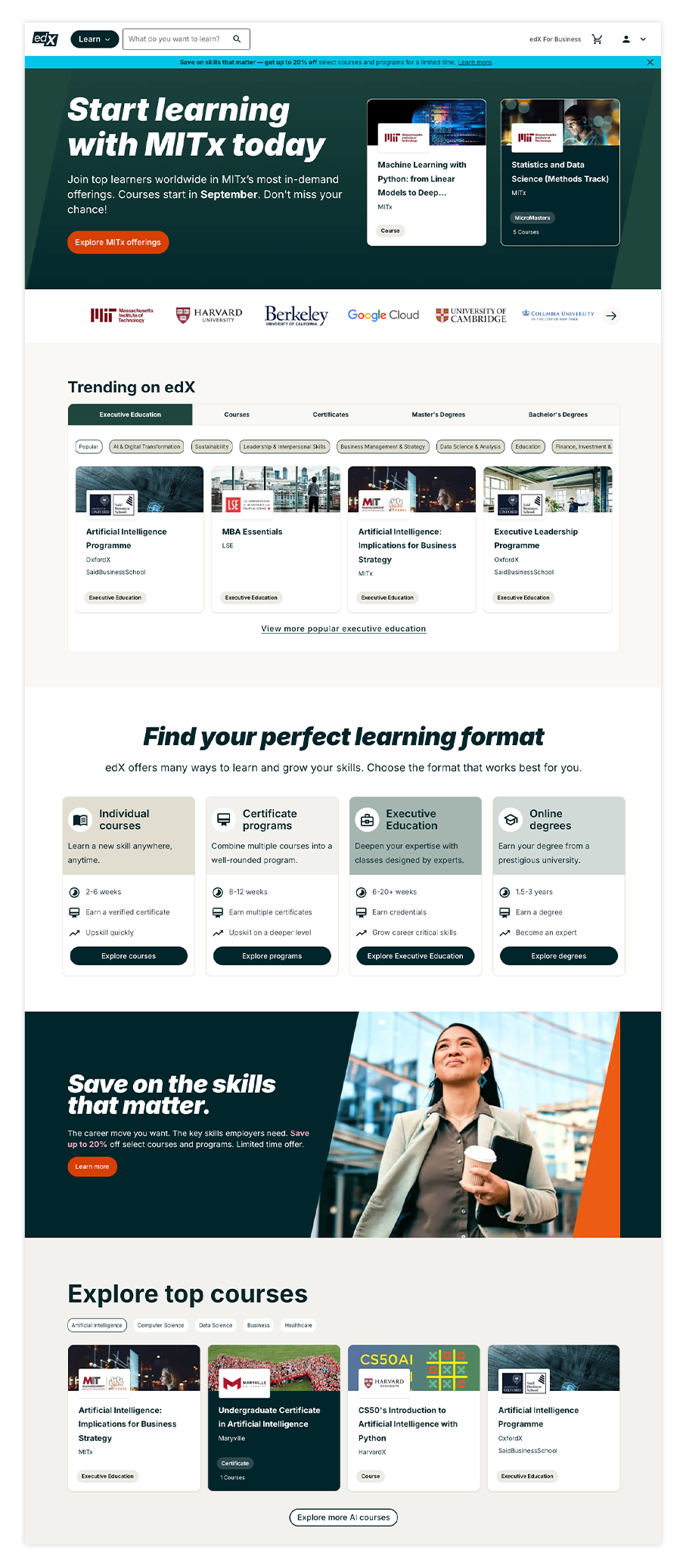 The edX homepage had become crowded with banners, categories, and competing entry points. While effective for users who arrived with a clear course in mind, it often left new and exploratory learners overwhelmed. I led the redesign effort to simplify discovery, reduce cognitive load, and create a more modern, personalized entry experience.