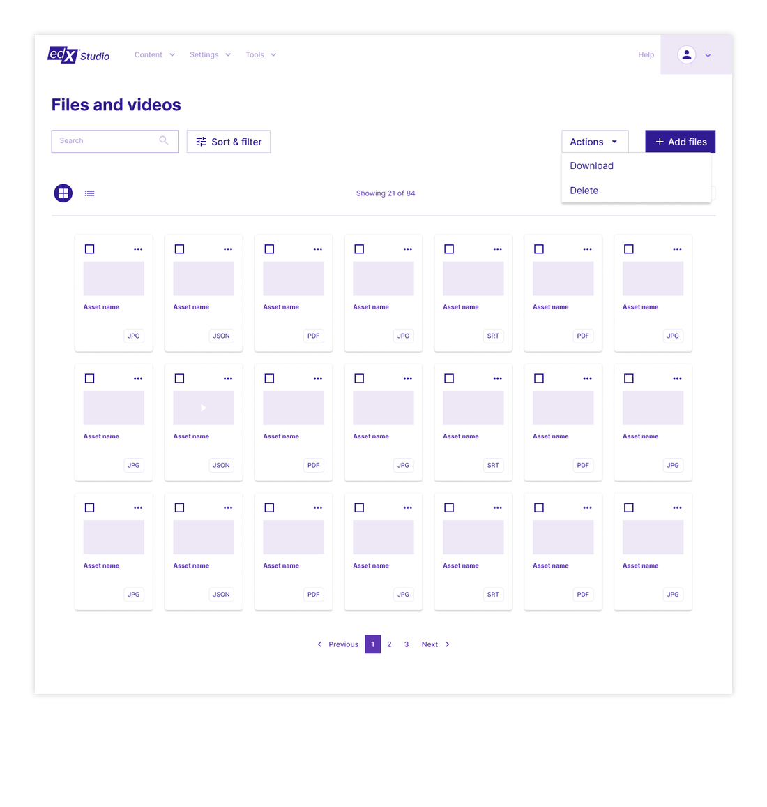 Example below is of the the bulk delete feature experience. Also showing new asset card design with selection box, preview, kabob menu and file type.